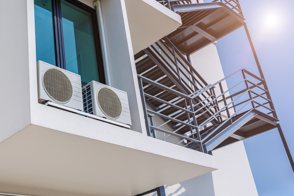 New AC system installation for a luxury apartment complex, focusing on quiet operation, comfort zoning, and energy efficiency.
